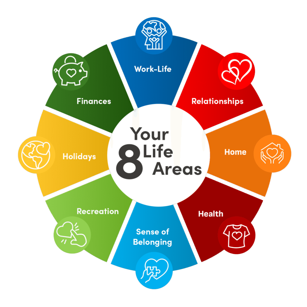 We focus on 8 key areas that shape your well-being: work-life balance, relationships, home, health, sense of belonging, recreation, holidays and finance. Explore each area and gain expert insights to start designing a life that aligns with your values and goals.